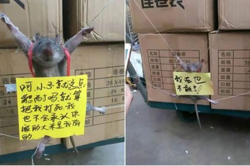 Pemilik kedai tersebut, Lai Tiancai mengikat tikus yang ditangkap dan menggantungkan nota pada haiwan tersebut sebagai 'hukuman' memalukan selain mahu memberi amaran kepada spesies berkenaan.