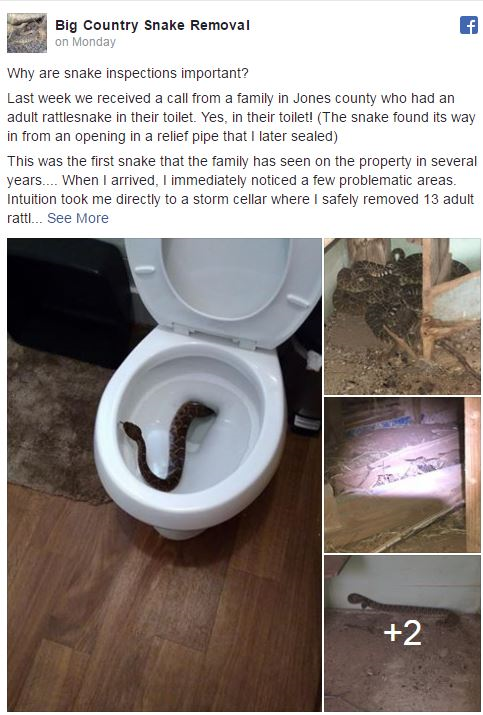 Kejadian itu berlaku di Jones dekat Buffalo Gap apabila pada awalnya, seekor ular dewasa ditemukan dalam mangkuk tandas.