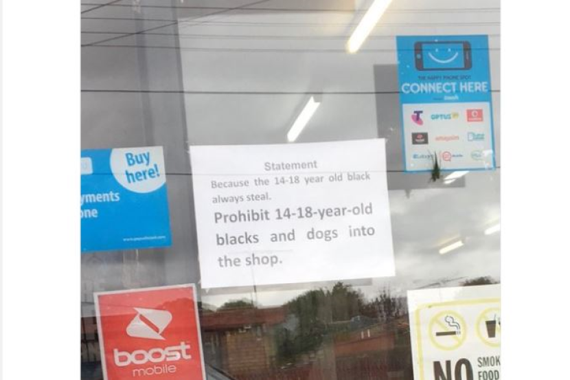 Ia tertulis," Disebabkan remaja berkulit hitam berusia 14-18 tahun sentiasa mencuri. Larangan buat remaja berkulit hitam 14-18 tahun dan ajing memasuki kedai."