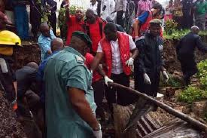 Menurut saksi, pegawai Palang Merah mengorek sisa runtuhan di tengah hujan lebat untuk mencari mangsa yang terselamat.