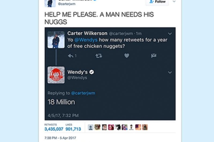 Selepas Carter mendapat sokongan berjuta-juta pengguna Twitter, Wendys akhirnya bersetuju untuk memberikan bekalan nuget ayam selama setahun kepada pemuda berkenaan.