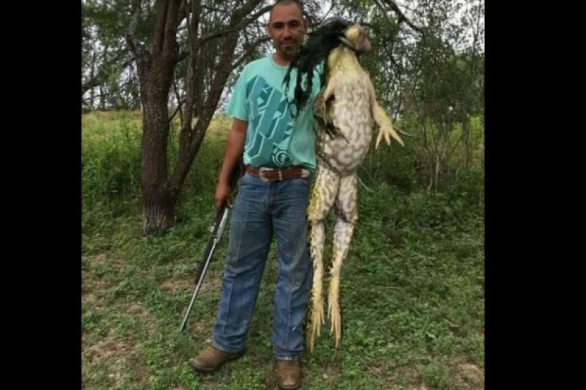 Sekeping gambar menunjukkan pemburu itu mengukir senyuman sambil mengangkat seekor katak seberat hampir 6 kilogram (kg) menggunakan satu tangan dan sebelah tangan lagi memegang senapang.