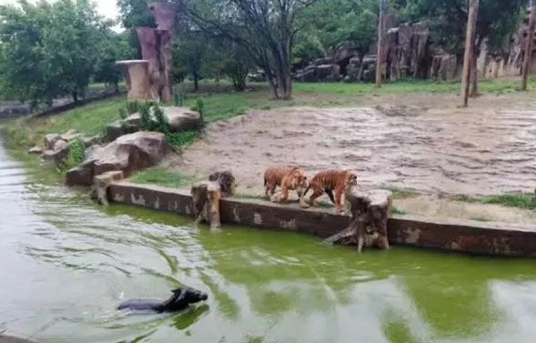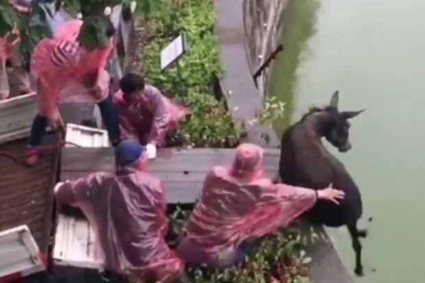 Keldai yang ketakutan itu ditolak pekerja yang memakai baju hujan sebelum jatuh ke dalam air yang mengelilingi kandang harimau dan terus diserang dua haiwan berkenaan.