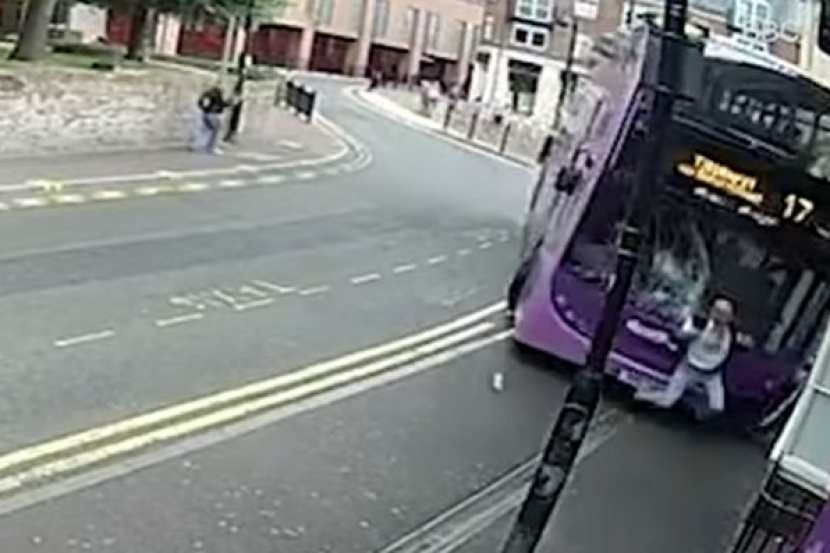 Rakaman kamera litar tertutup (CCTV) menunjukkan sebuah bas bernombor 17 tahun merempuh sebahagian hadapan sebuah kedai, mengakibatkan serpihan berterbangan di Gun Street di bandar Berkshire, Sabtu lalu.