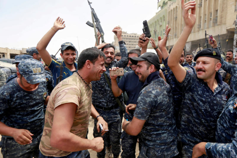 Puluhan askar Iraq meraikan kejayaan itu berhampiran runtuhan bangunan di tebing Sungai Tigris tanpa menunggu pengumuman kemenangan rasmi oleh kerajaan.