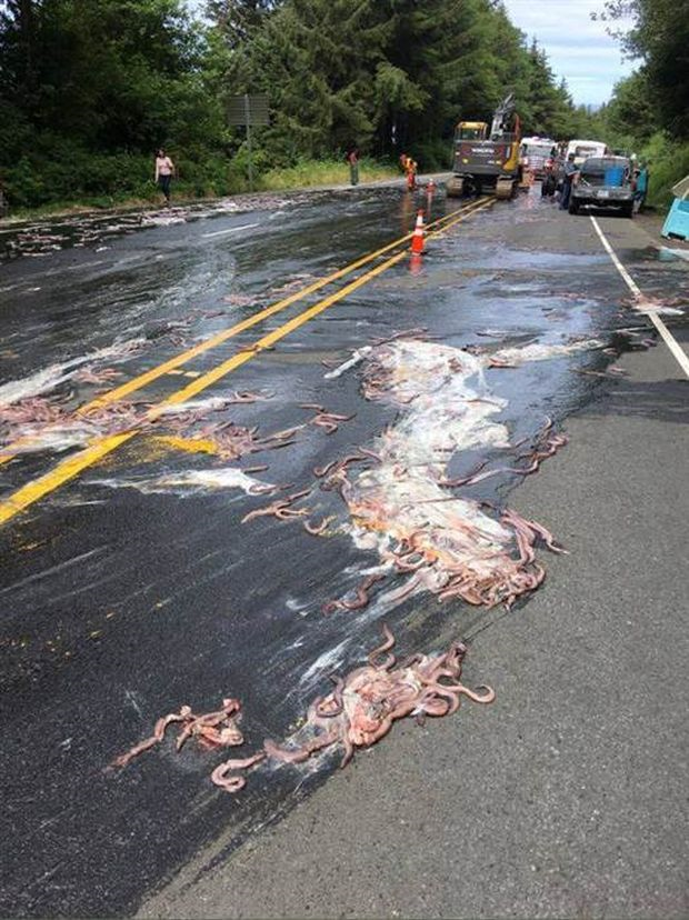 Keadaan itu berpunca daripada sebuah trak yang terbalik di lebuh raya Oregon lalu menumpahkan sebanyak 3.4 tan belut ke atas jalan raya.