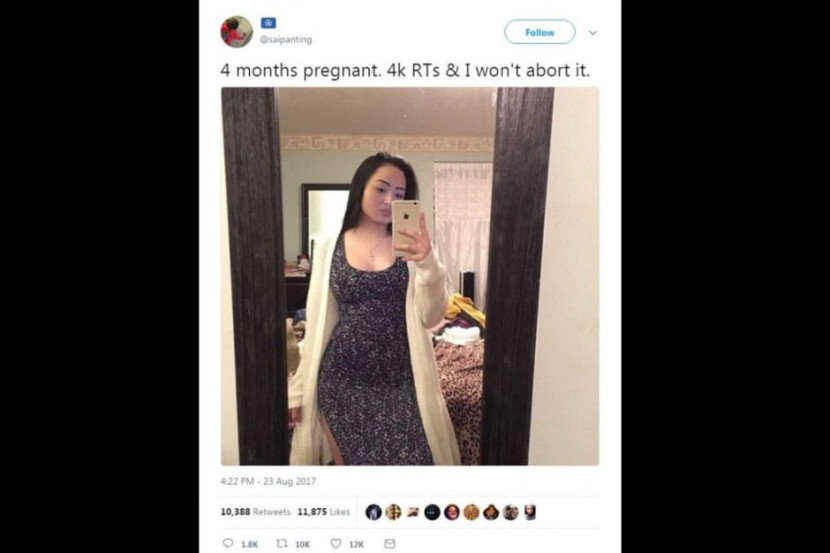 Dengan menggunakan akaun bernama Saipanting, wanita yang tidak diketahui nama sebenarnya itu, mengeluarkan tweet berbunyi, "4 bulan mengandung. 4,000 RT dan saya tidak akan menggugurkan bayi ini."
