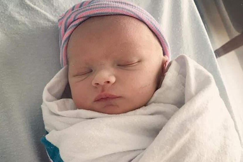 Gambar yang dimuat naik Lara menunjukkan bayinya yang baru lahir sedang mengeliat di bawah selimut hospital yang berwarna merah jambu, putih dan biru.