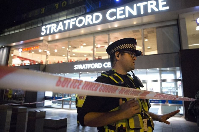 Anggota polis mengawal kawasan sekitar pusat membeli-belah Stratford berikutan insiden serangan asid yang mengakibatkan sekurang-kurangnya lapan orang cedera. Foto Mail Online