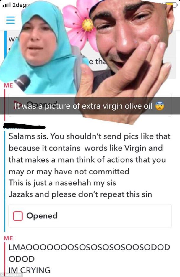 Tuduhan itu dilemparkan kepadanya selepas memuat naik gambar minyak zaitun yang tertera perkataan 'virgin oil' yang mana perkataan 'virgin' bermaksud dara.