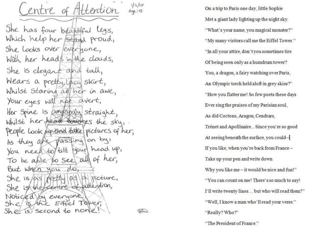 Gadis dari Britain itu menulis puisi tersebut pada April, selepas dia terpesona dengan mercu tanda pencakar langit berkenaan ketika melawat Paris bersama keluarganya.