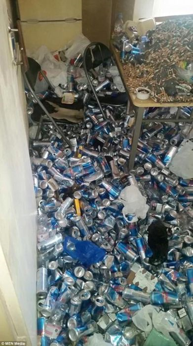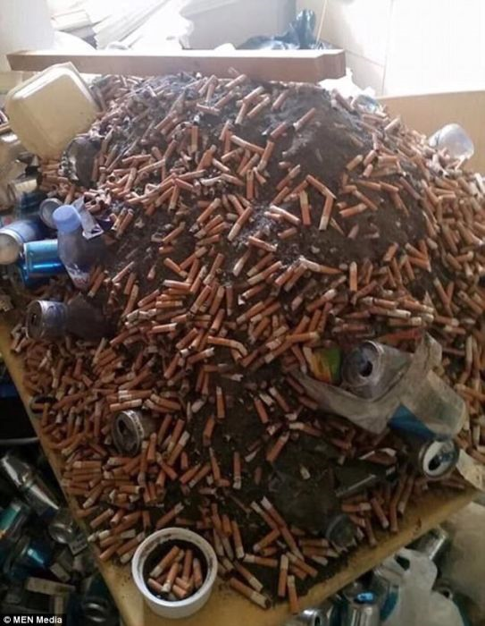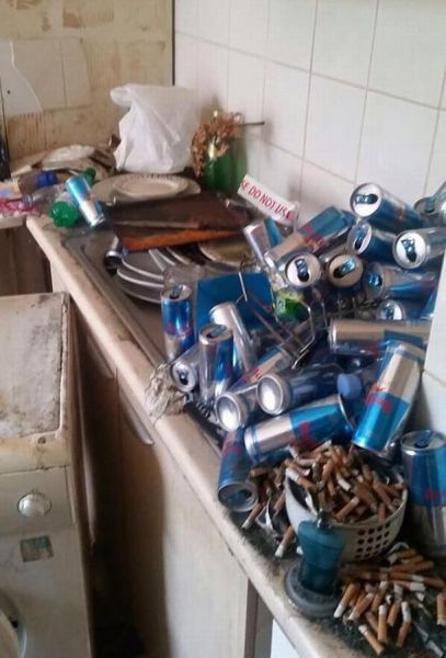 BEBERAPA keping gambar menunjukkan sebuah rumah ditimbuni dengan puntung rokok, tin kosong minuman Red Bull dan pembungkus makanan telah tular.