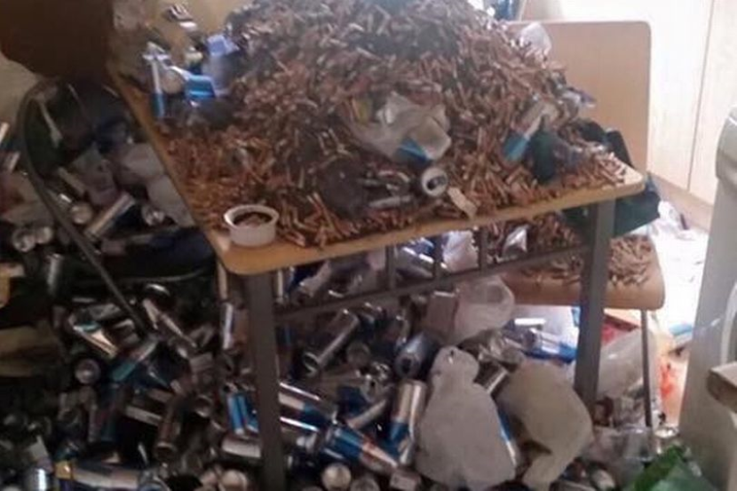 Lantai dapur tidak lagi dapat dilihat kerana ditimbuni beratus-ratus tin, botol dan beg plastik.