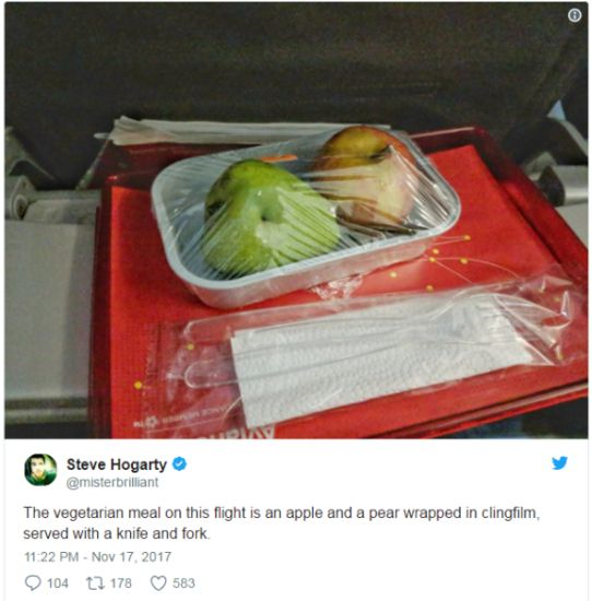 "Hidangan vegetarian penerbangan ini adalah buah epal dan pear yang dibungkus dalam plastik lutsinar, bersama pisau dan garfu," kata Hogarty, wartawan yang berpangkalan di London.