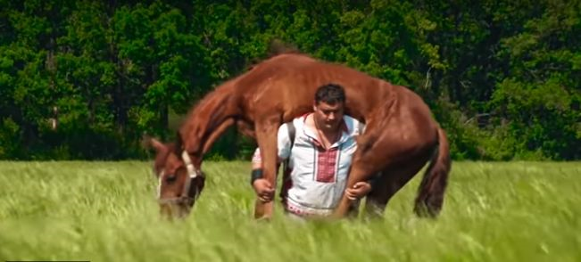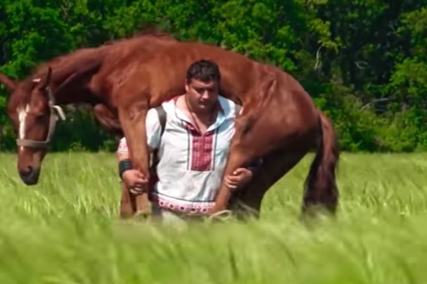 Juara angkat berat Dmytro Khaladzhi telah menjadikan namanya lebih kukuh dengan memikul seekor kuda di belakangnya bagi membuktikan kekuatannya yang luar biasa.