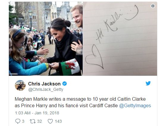 Semasa lawatan rasmi ke Cardiff, Wales, pada Sabtu, tunang Putera Harry itu dilaporkan menulis sesuatu dalam buku autograf seorang budak perempuan bernama Caitlin Clark, tetapi Markle tidak menurunkan tandatangannya, kerana ia adalah protokol yang perlu dipatuhinya.