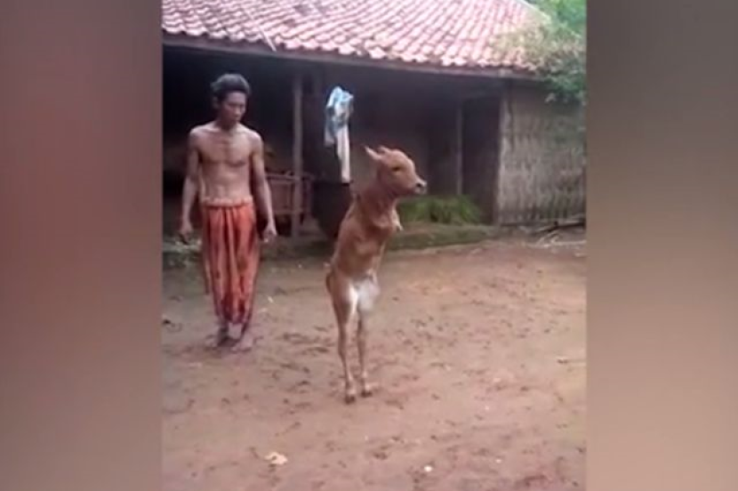 SEBUAH rakaman video pelik menunjukkan anak lembu berjalan seperti manusia dengan dua kaki dan dua tangan yang kudung tular di internet.