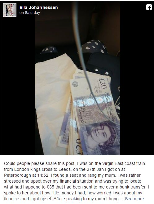 SEORANG wanita berterima kasih kepada insan yang tak dikenali selepas meninggalkan wang £100 (RM553) di atas ribanya.