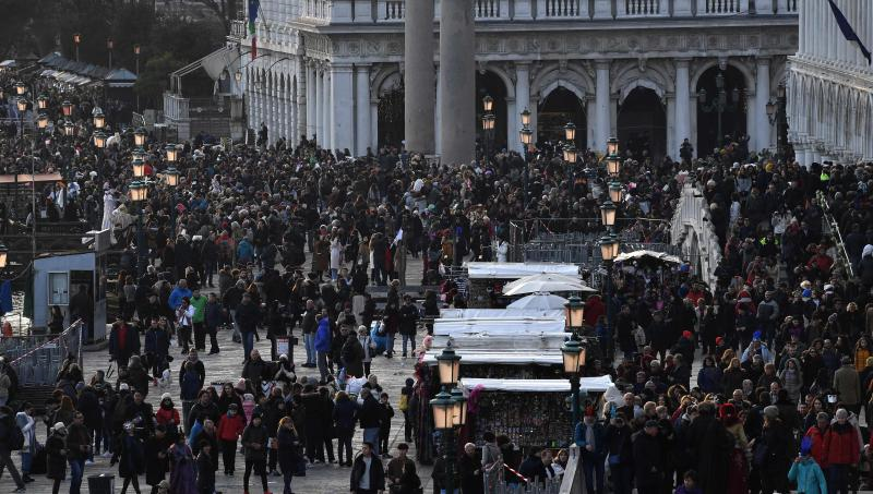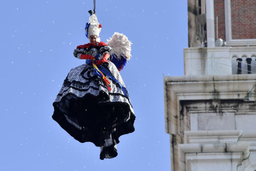 Dataran St Mark dipenuhi lautan manusia pada Ahad ketika 'pari-pari berterbangan' melakukan persembahan pembukaan di Karnival Venice.