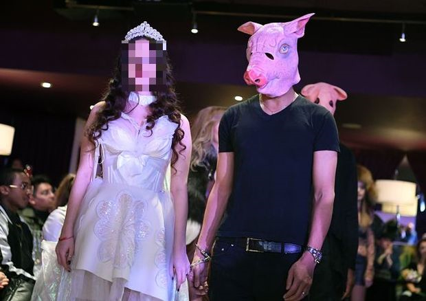 Model-model yang berjalan di atas pentas peragaan itu, masing-masing ditemani lelaki yang memakai topeng babi dengan tangannya digari.