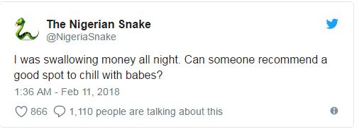 Malah, satu akaun Twitter telah dibuka untuk ular itu yang mendakwa ia 'sangat letih' selepas menelan wang yang banyak dan mahu bergembira.