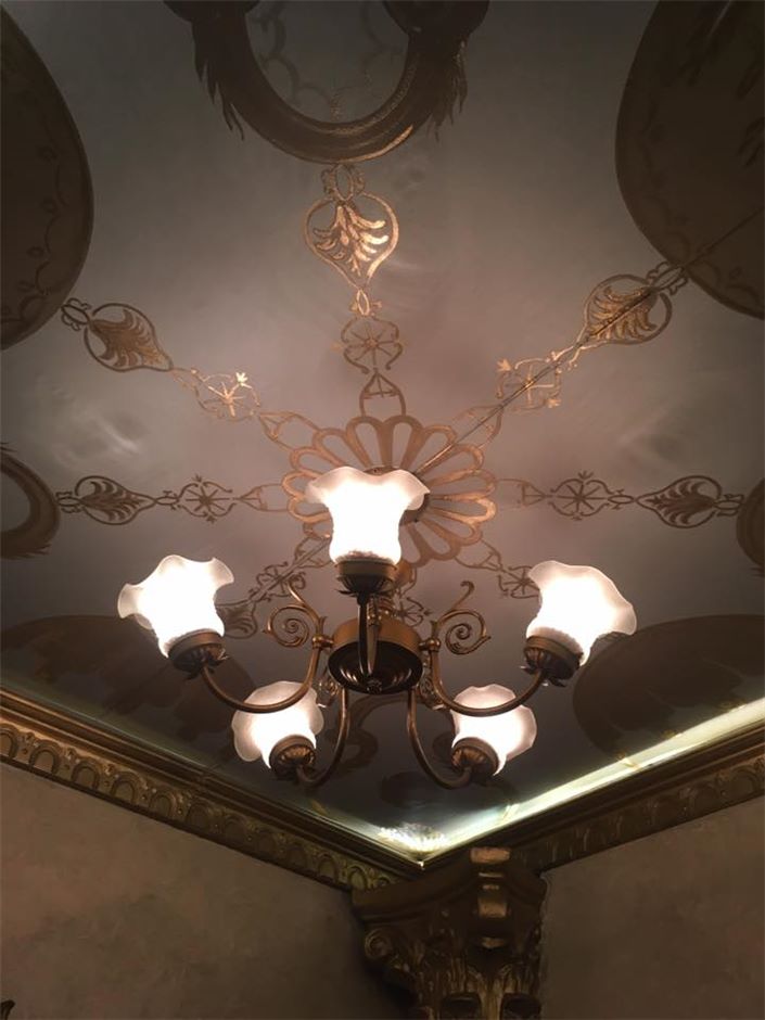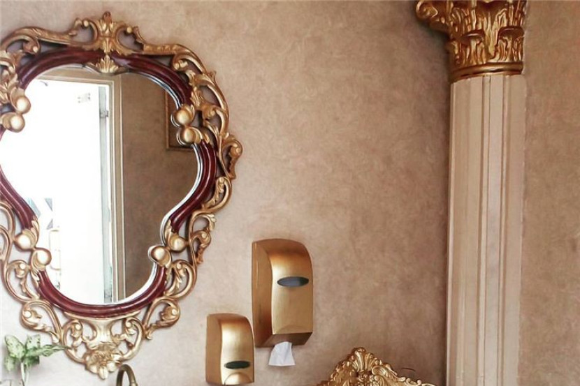 Ia memiliki hiasan dinding dan siling keemasan, cermin disalut emas, lampu candelier kecil dan juga rangka takhta kayu di sekeliling mangkuk tandas.