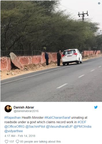 Kalicharan Saraf, menteri kesihatan untuk negeri Rajasthan, India, dirakamkan gambarnya sedang kencing di sebuah dinding Jaipur.