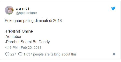 Malah, Bu Dendy menjadi begitu popular sehingga namanya menjadi topik ke-13 dalam Twitter di seluruh dunia pada Selasa, seperti dilaporkan oleh Kumparan.