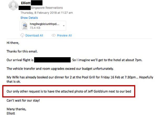 Tidak dapat dipastikan sejauh mana pihak hotel akan melihat permintaan seperti ini sebagai serius dan patut dilayan, tetapi Mariott Tang Plaza, Singapura, menurutkan sahaja permintaan bakal tetamu mereka.