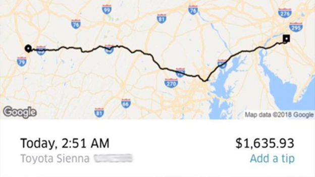 SEORANG pengguna Uber terkejut dengan kadar tambang AS$1,635 (RM6,426) yang perlu dibayarnya setelah dia tertidur dan memulakan perjalanan sejauh 300 batu di tiga negeri.