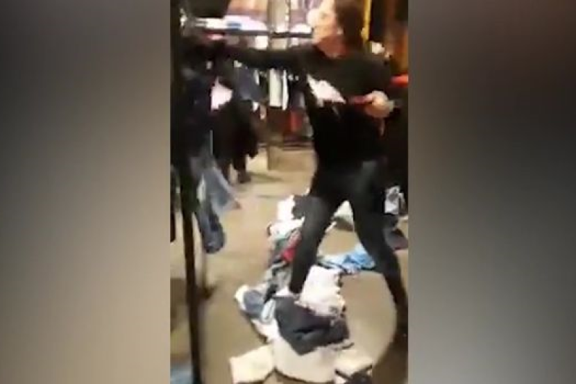 Puluhan pakaian telah dicampakkan ke lantai selepas wanita itu menariknya dari penyangkut baju yang disusun rapi di premis itu.