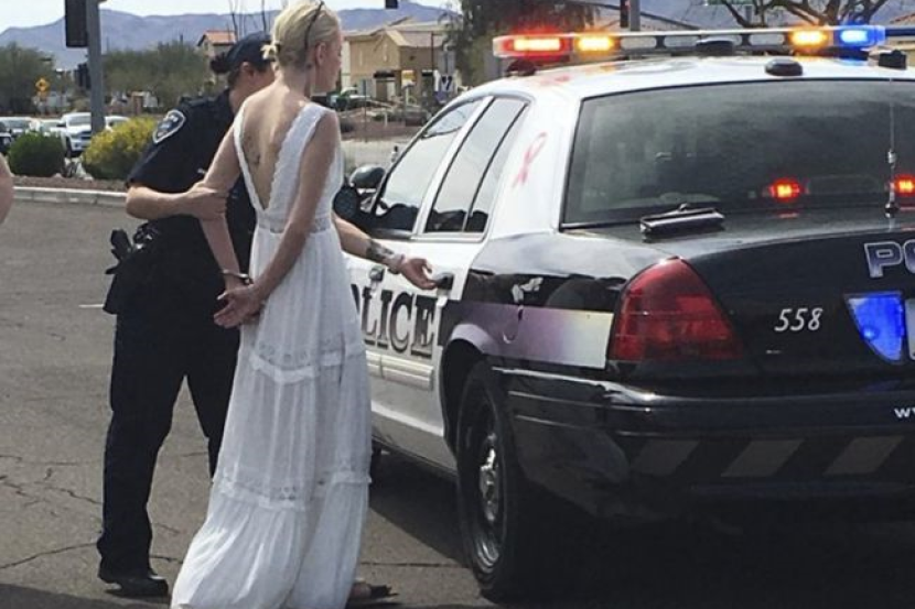 Amber Young, 32, sedang memakai gaun pengantin apabila dia digari dan dimasukkan ke dalam kenderaan polis dalam kejadian di Marana, selatan Arizona, 30 batu di utara Tucson.