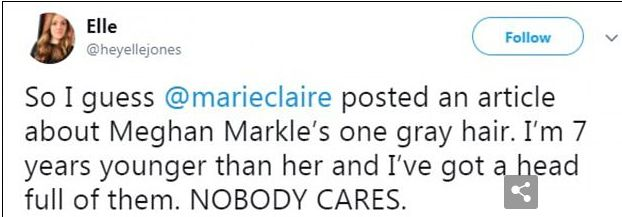 Artikel tersebut bertajuk: 'Meghan Markle Mempunyai Sehelai Uban', sementara tajuk kecilnya ditulis 'Dan itu luar biasa'.
