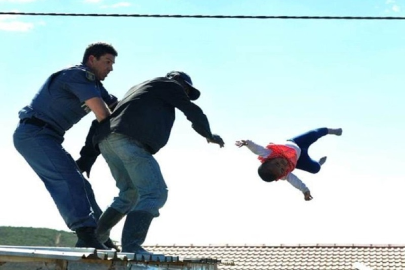 Menurut jurucakap polis, Kapten Andree Beetge, bapa berusia 38 tahun itu memanjat bumbung sambil mendukung bayi perempuan berusia enam bulan sebagai usaha menghalang rumah mereka daripada dirobohkan.
