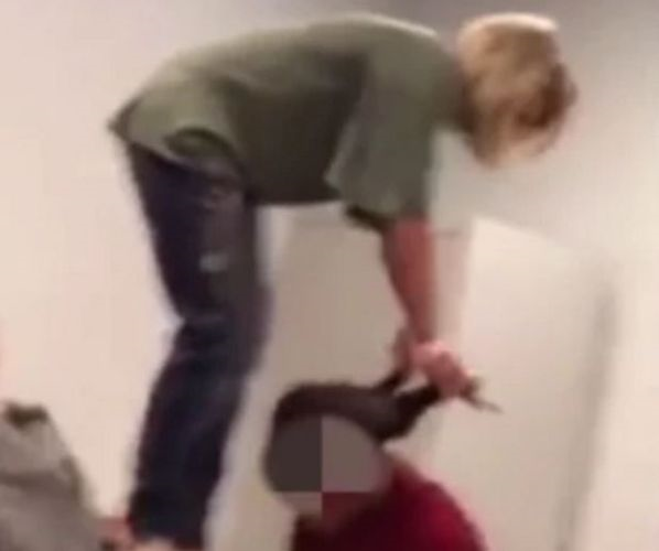 Pelajar lain dapat didengari hanya ketawa ketika wanita itu memijak dada rakan mereka dan menyandarkan untuk dilempang.