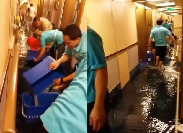 RAKAMAN penuh dramatik menunjukkan koridor dalam sebuah kapal persiaran dinaiki air dengan kakitangan cuba untuk menyelesaikan masalah 'banjir' itu.