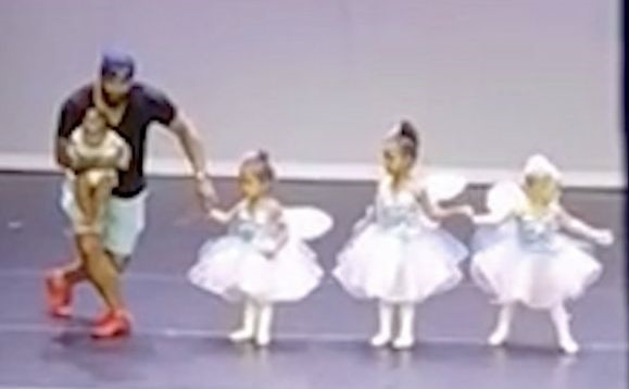 Daniels yang sedang mendukung anak bongsunya, Suri, terus berlari naik ke pentas, menghulurkan tangannya kepada Bella dan bersama-sama membuat persembahan balet.