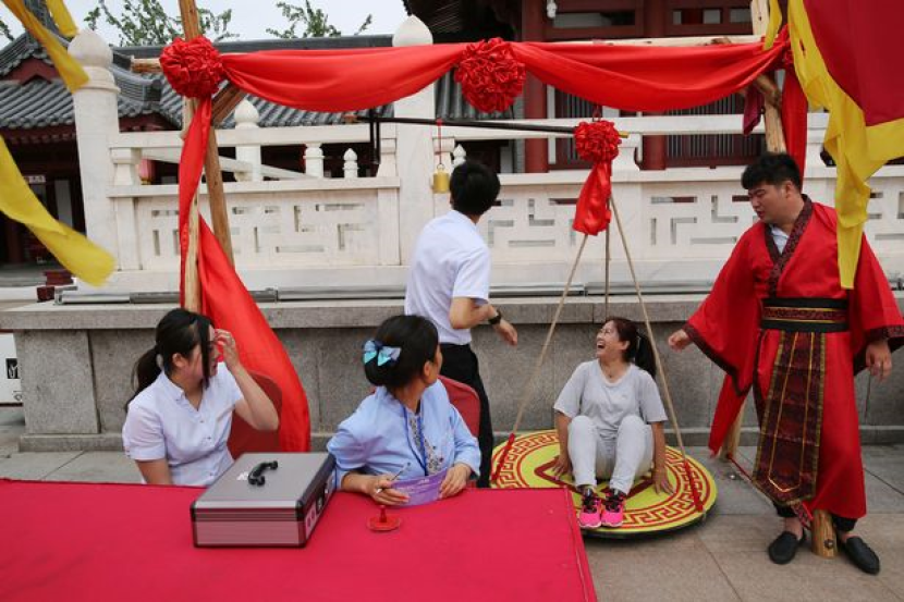 Mana-mana wanita dijemput untuk menimbang berat badan mereka pada pemberat gergasi di pintu masuk Tang Paradise di bandar Xi'an di tengah China.