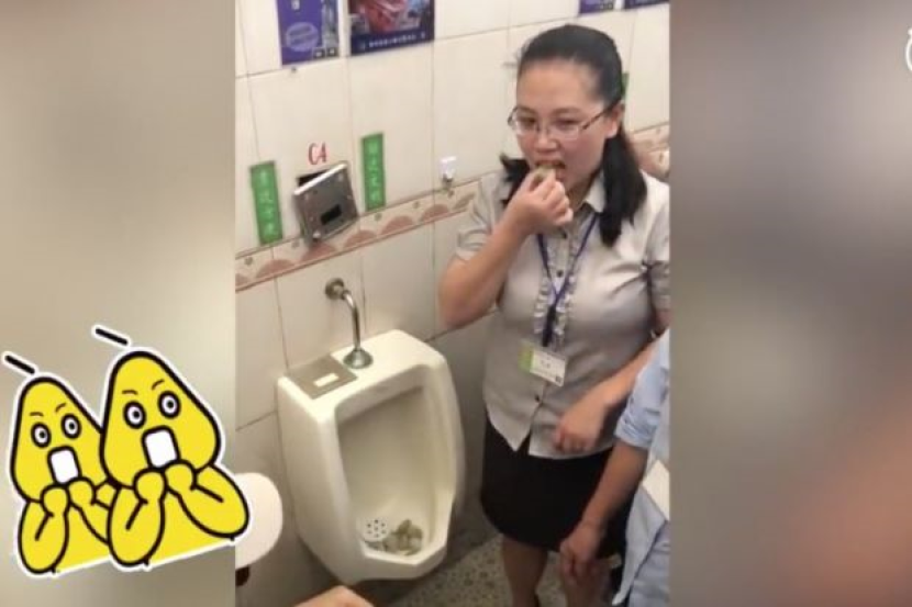 Menerusi klip berasingan, seorang wanita yang juga penyelia di syarikat di Zhangzhou, wilayah Fujian itu telah meletakkan beberapa bebola nasi ke mangkuk tempat membuang air kecil lelaki.