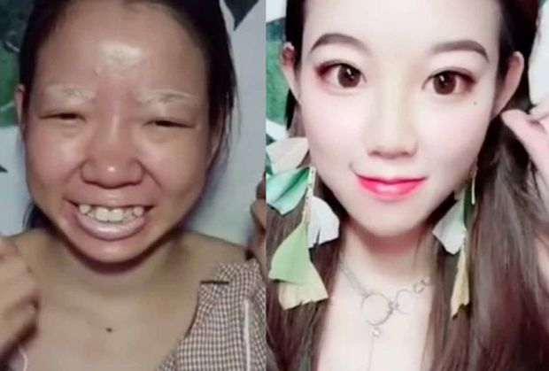 Wajah Huahua sebelum dan selepas mengenakan solekan.