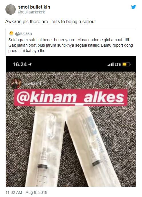 Dengan pendapatan setinggi itu Awkarin sepatutnya mampu bersikap selektif untuk produk yang mahu disokong, tetapi dia sebaliknya bertindak mempromosi produk yang dianggap netizen sangat tidak bertanggungjawab.