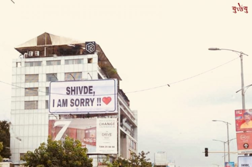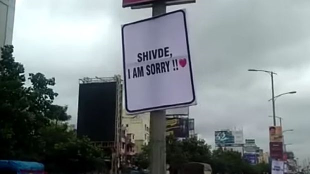 Ratusan poster pelbagai saiz dengan mesej "Shidve, I Am Sorry!" (Shivde, Saya Minta Maaf!).
