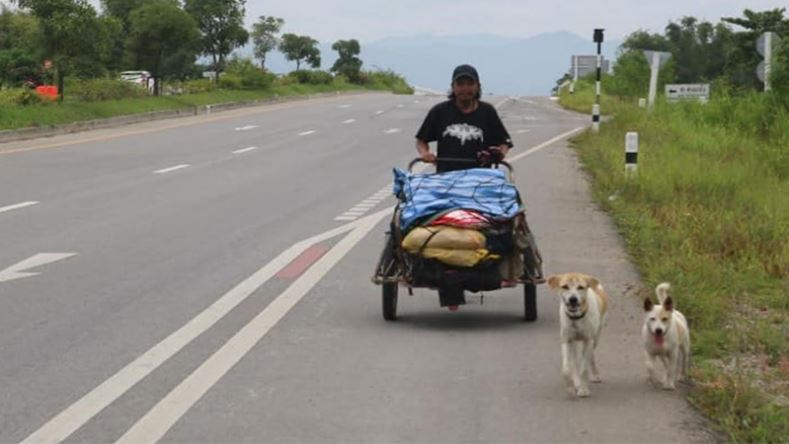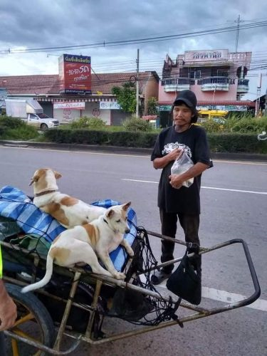 Sepanjang perjalanan, dia ditemani tiga haiwan jalanan yang menyertai perjalanannya, menurut beberapa saluran media Thailand.