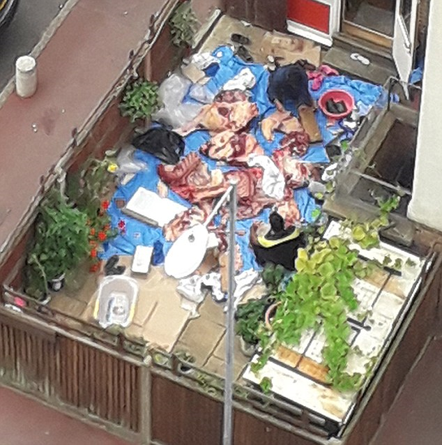 Gambar dari atas halaman belakang rumah mereka menunjukkan daging mentah diletakkan di atas plastik biru. Dua lelaki kelihatan sedang berada di situ.
