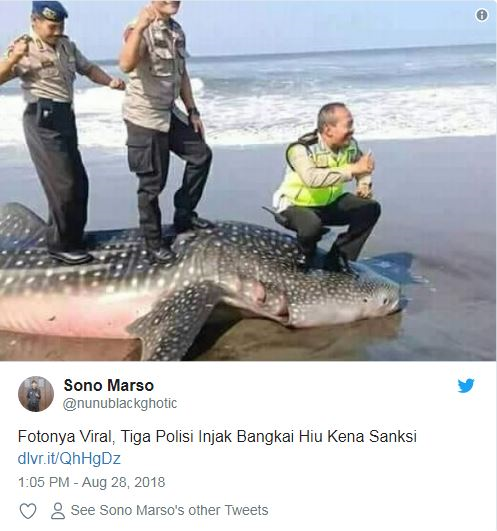 HANYA dua minggu selepas polis menangkap sekumpulan penyelam yang 'menunggang' ikan jerung di Papua Barat, Polis Jogjakarta kini memohon maaf bagi pihak tiga pegawainya yang dirakam memijak dan berposing di atas bangkai seekor lagi jerung.