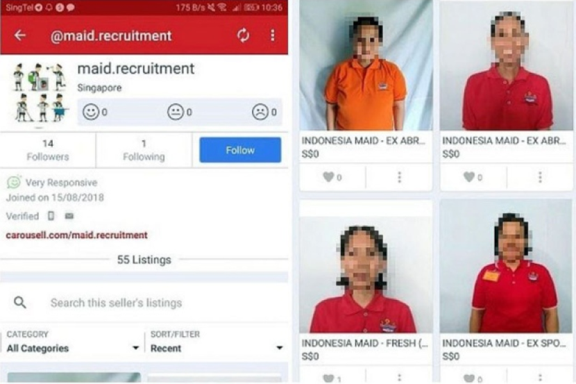 Dalam satu senarai yang diiklankan @maid.recruitment di Carousell 15 Ogos lalu, beberapa wajah pembantu rumah didakwa dari Indonesia telah dimuat naik. Malah, ada sesetengah profil menunjukkan ia telah dijual.
