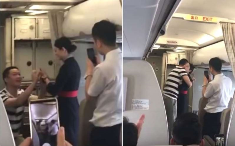 Para penumpang merakamkan saat-saat manis ini dengan telefon bimbit mereka dan nampaknya mereka tersentuh dengan tindakan romantis kekasih pramugari berkenaan.