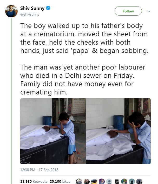Seorang wartawan di The Hindustan Times, Shiv Sunny yang memuat naik posting itu di Twitter pada Isnin memberitahu BBC bahawa dia terkejut melihat budak lelaki berusia 11 tahun itu yang sedang bersedih di tepi mayat bapanya.