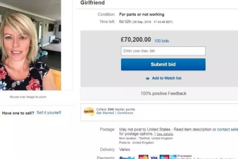 SEORANG lelaki dari Essex, United Kingdom, bertindak menyenaraikan teman wanitanya untuk dijual di eBay dan terkejut apabila harganya meningkat kepada lebih £70,200 (RM381,028) dalam tempoh 24 jam, menurut laporan pada Sabtu.