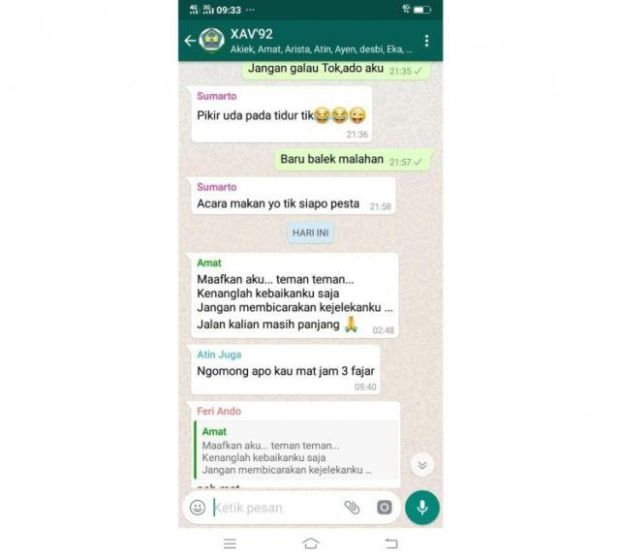 Pada pukul 3 pagi Rabu, dia menghantar mesej kepada kumpulan WhatsApp sekolah menengahnya, dengan memohon kemaafan dan meminta supaya hanya mengingati perbuatan baiknya selama ini.